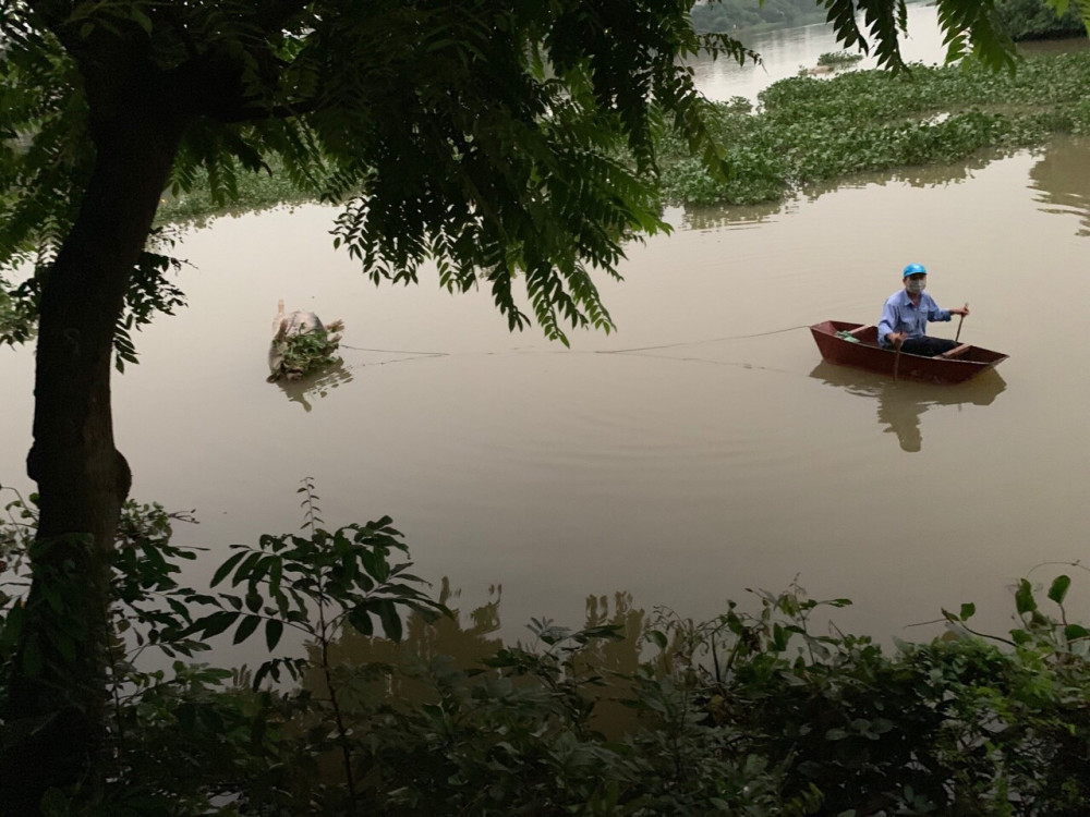 Cán bộ Công ty TNHH MTV khai thác công trình thuỷ lợi An Hải vớt xác lợn trôi trên sông Rế