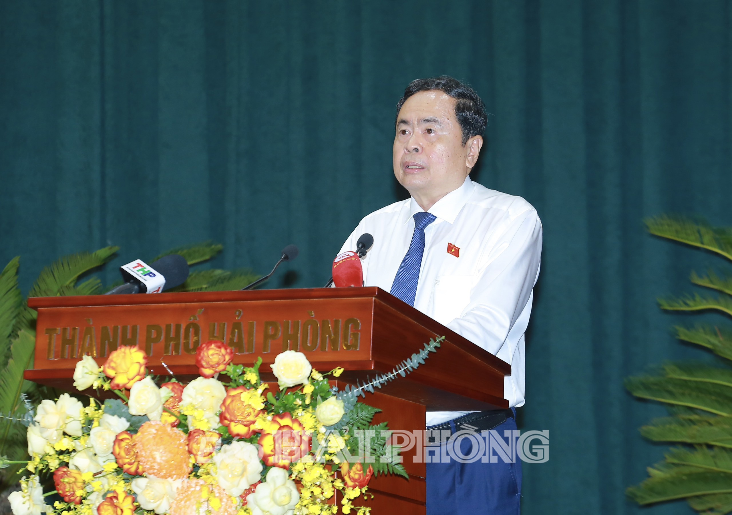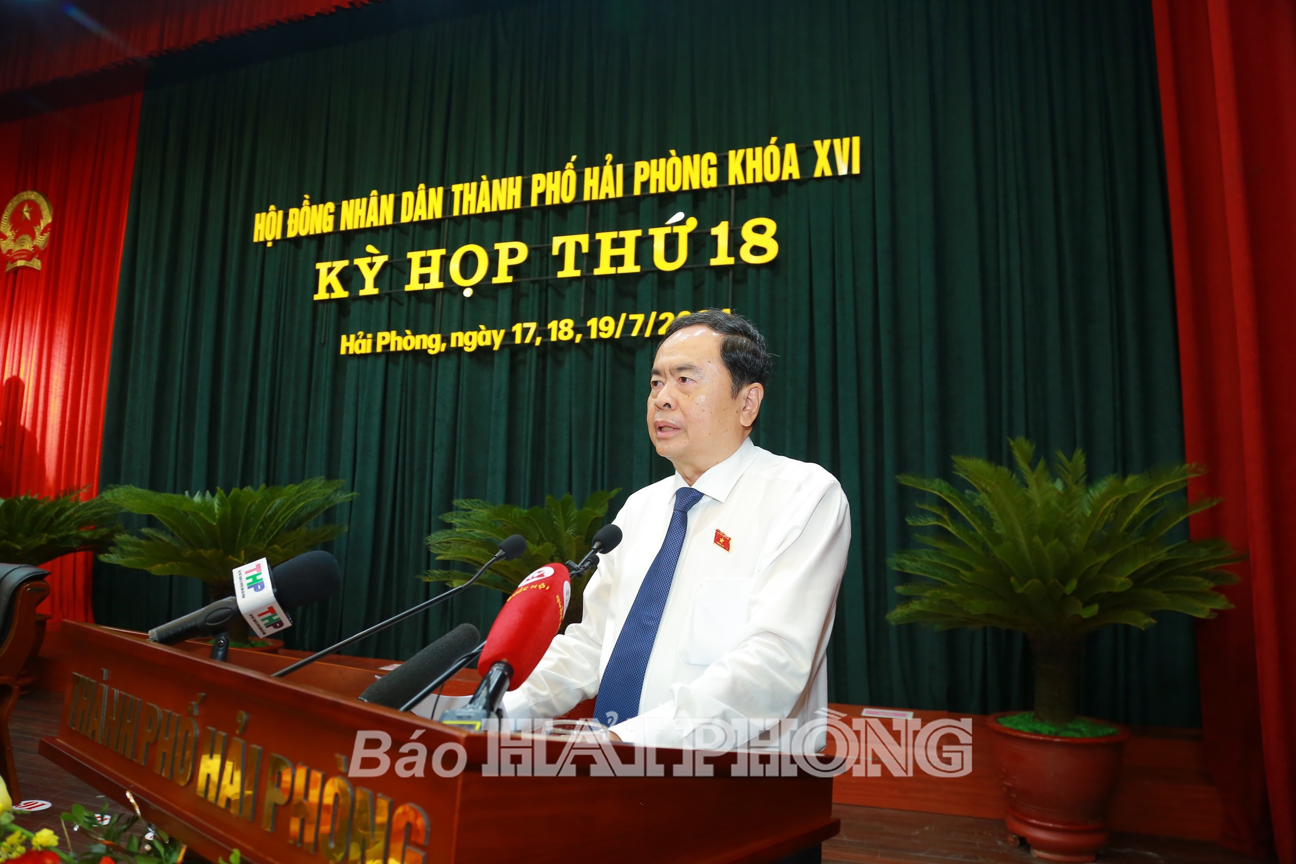 Hôm nay, tôi rất vui mừng về dự Kỳ họp thứ 18, HĐND thành phố Hải Phòng Khóa 16, nhiệm kỳ 2021-2026. Trước hết, thay mặt Ủy ban Thường vụ Quốc hội, tôi xin gửi tới các đồng chí lãnh đạo thành phố Hải Phòng, các đại biểu HĐND, cùng toàn thể quý vị đại biểu, cử tri và Nhân dân thành phố Hải Phòng lời thăm hỏi thân tình và lời chúc mừng tốt đẹp nhất.