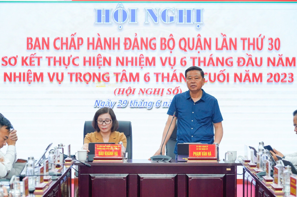 Phát biểu tại Hội nghị, đồng chí Đào Khánh Hà, Ủy viên BTV Thành ủy, Trưởng Ban Tuyên giáo Thành ủy ghi nhận những nỗ lực, tích cực của Quận ủy và các cấp ủy trong công tác lãnh đạo, chỉ đạo, đến nay quận đã hoàn thành 6/19 chỉ tiêu kế hoạch năm. Đề cập về nhiệm vụ trọng tâm trong 6 tháng cuối năm, Trưởng Ban Tuyên giáo Thành ủy yêu cầu quận Ngô Quyền tập trung phân tích, làm rõ hạn chế, nguyên nhân khách quan, chủ quan, trong đó tập trung vào những khâu yếu, chưa đạt để có giải pháp, phấn đấu hoàn thành kế hoạch năm. Đồng chí cũng đề nghị Quận ủy Ngô Quyền chú trọng công tác xây dựng Đảng, hệ thống chính trị và vận động nhân dân; việc triển khai cần đi vào thực chất với cách làm đổi mới, sáng tạo; đẩy mạnh Chuyển đổi số, phấn đấu vươn lên vị trí dẫn đầu về CCHC; tổ chức thành công diễn tập chiến đấu khu vực phòng thủ quận năm 2023; cải thiện môi trường đầu tư kinh doanh, tăng thu ngân sách cùng nhiều nội dung quan trọng khác…