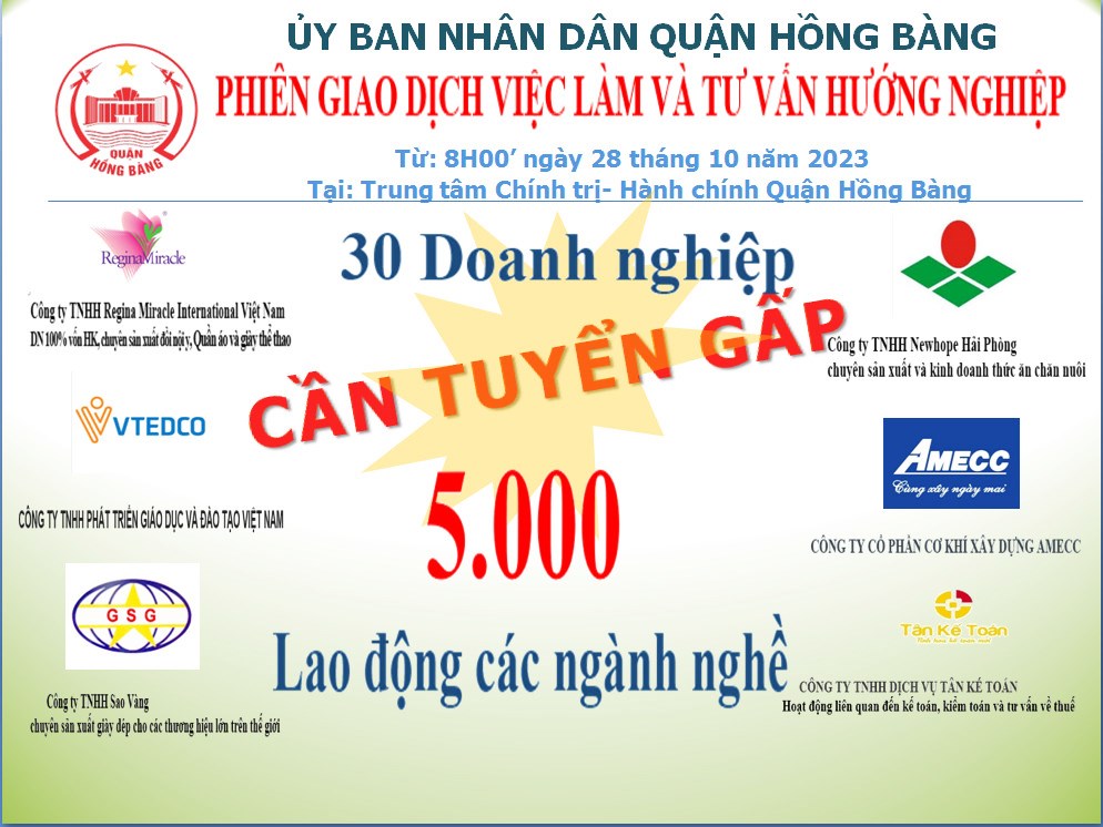 UBND quận Hồng Bàng sẽ tổ chức “Phiên giao dịch việc làm và tư vấn hướng nghiệp năm 2023” vào 8h00 ngày 28/10/2023 tại Trung tâm Chính trị-Hành chính quận.