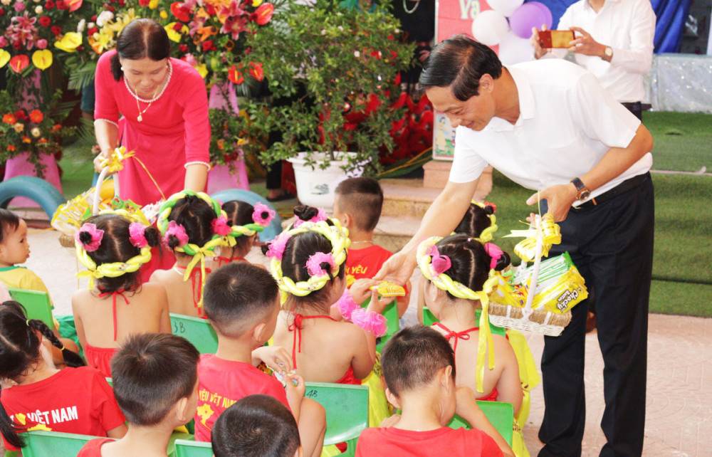 Đồng chí Đỗ Mạnh Hiến, Phó Bí thư Thường trực Thành ủy đến thăm, tặng quà các cháu thiếu nhi Trường Mầm non Đông Hưng, xã Đông Hưng. Trường hiện có 32 cán bộ, nhân viên, 348 học sinh, trong đó nhà trẻ có 54 cháu, mẫu giáo có 294 cháu. Đồng chí ghi nhận sự cố gắng của cán bộ, giáo viên nhà Trường trong việc nâng cao chất lượng nuôi dạy trẻ. Nhân dịp Tết Trung thu, đồng chí chúc các cháu thiếu nhi đón mùa Trung thu vui tươi, an toàn và tràn ngập niềm vui; mong các cháu luôn chăm ngoan, học giỏi, vâng lời cô giáo và cha mẹ.