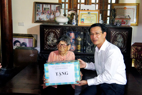 Đến thăm gia đình Mẹ Việt Nam anh hùng Lê Thị Đích, 101 tuổi, ở thôn Chợ Giá, xã Kênh Giang, Phó Chủ tịch HĐND thành phố Bùi Đức Quang chúc Mẹ dồi dào sức khỏe, sống lâu, tiếp tục phát huy truyền thống gia đình, là tấm gương sáng đối với thế hệ trẻ ở địa phương.