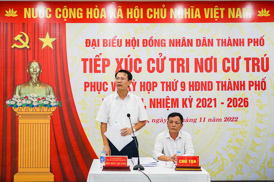 Tối 23/11, đồng chí Bùi Đức Quang, Ủy viên Thành ủy, Phó Chủ tịch HĐND thành phố tiếp xúc cử tri nơi cư trú tại phường Vĩnh Niệm, quận Lê Chân chuẩn bị kỳ họp thứ 9, HĐND thành phố khóa XVI, nhiệm kỳ 2021-2026.