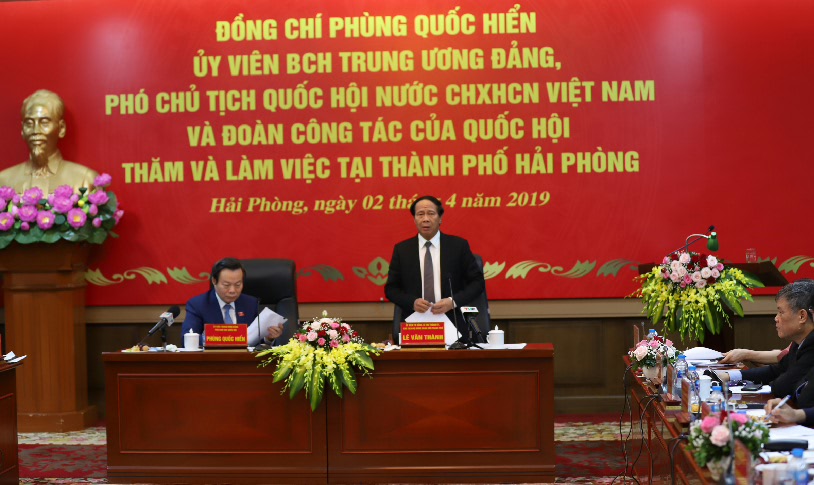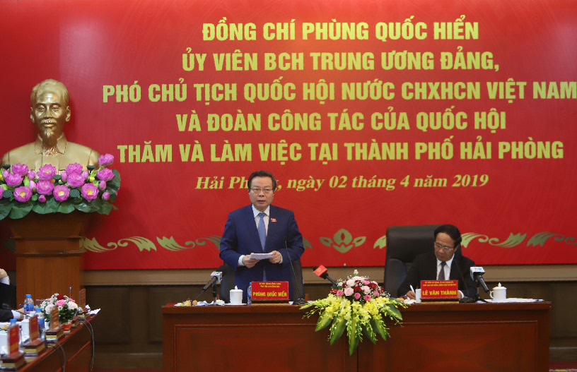 Chiều 2-4, đồng chí Phùng Quốc Hiển, Ủy viên TW Đảng, Phó Chủ tịch Quốc hội cùng đoàn công tác của Quốc hội làm việc với lãnh đạo TP Hải Phòng về tình hình thực hiện nhiệm vụ phát triển kinh tế – xã hội thành phố theo Nghị quyết Đại hội Đảng bộ TP nhiệm kỳ 2015 – 2020; tình hình phát triển ngành công nghiệp và phát triển kinh tế biển theo Nghị quyết số 36-NQ/TW.