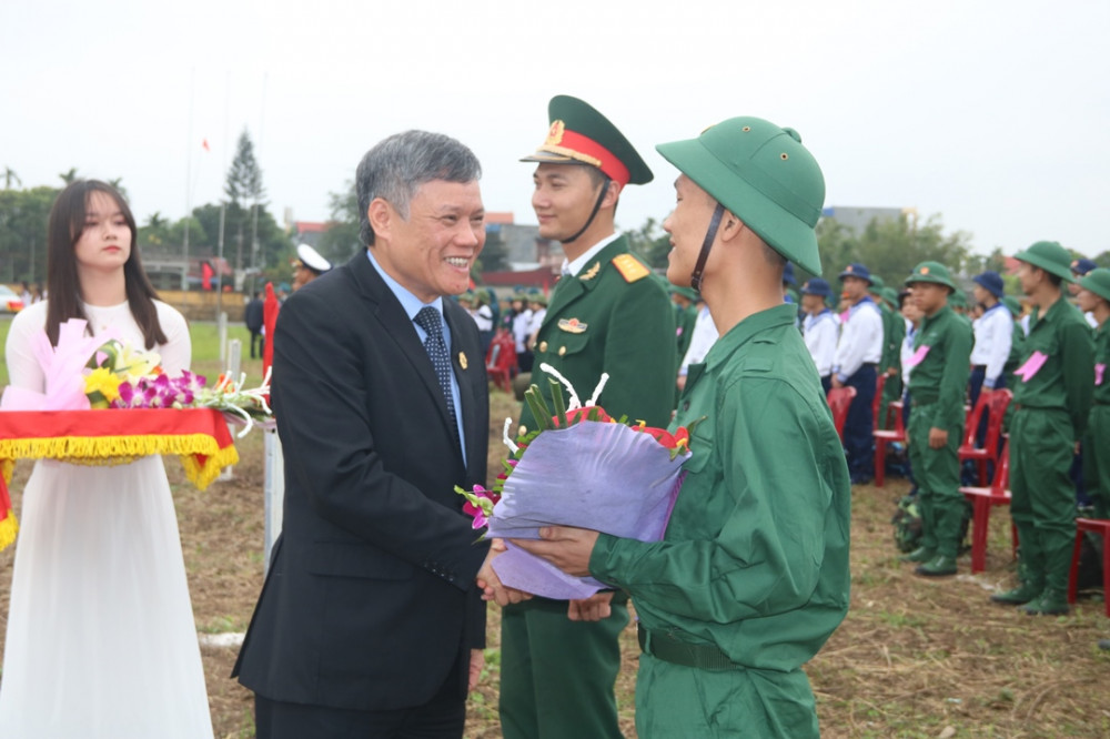 Đồng chí Nguyễn Xuân Bình- Phó Chủ tịch Thường trực UBND TP tặng hoa động viên thanh niên lên đường nhập ngũ