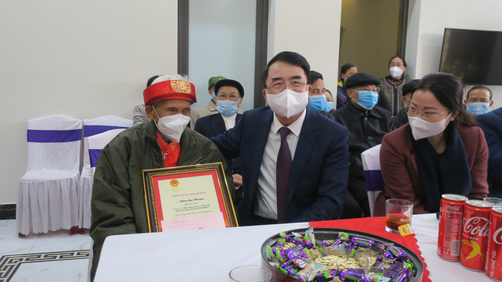 Thừa ủy quyền của Chủ tịch nước, Phó Chủ tịch UBND thành phố Lê Khắc Nam trao Thiếp mừng thọ và quà của Chủ tịch nước cho cụ Phạm Quý Nhường, sinh năm 1922, tại thôn Kinh Lương, xã Cấp Tiến; và cụ Nhữ Thị Bần, sinh năm 1922 tại thôn Nam Tử 2, xã Kiến Thiết.