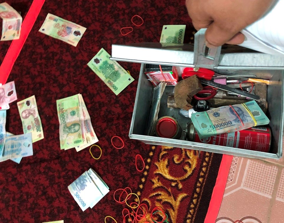 Kiểm tra hiện trường, cơ quan công an thu giữ: hơn 12 triệu đồng trên chiếu bạc, 50 triệu đồng trong thùng “tẩy”, 1 bộ bát đĩa sứ và 4 quân vị, 1 bộ dụng cụ đột quân vị (búa, thanh đột), 1 xe ô tô 29 chỗ BKS 14B-032.72, ghế nhựa cùng một số tang vật khác có liên quan.