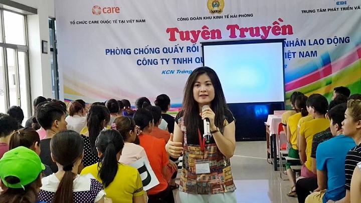 Chiều 7-7, Công đoàn Khu Kinh tế Hải Phòng phối hợp với Trung tâm Hội nhập và Phát triển CDI, Tổ chức Care Quốc tế tại Việt Nam tổ chức chương trình truyền thông phòng chống QRTD tới công nhân lao động Công ty quốc tế thời trang Việt Nam (KCN Tràng Duệ, An Dương).