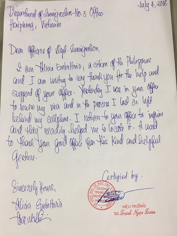 Vừa qua, Phòng Quản lý Xuất nhập cảnh (PA72-CATP) nhận được thư cảm ơn của bà Alicia Emboltorio, công dân nước Cộng hòa Philippines, hiện là giảng viên tại trường Trung cấp chuyên nghiệp Hải Phòng, về việc bà đã được cán bộ chiến sĩ đơn vị giúp đỡ và hỗ trợ tìm lại tài sản bị đánh mất.