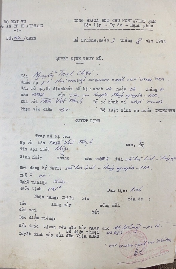 Theo đó, trinh sát Đội 6 dưới sự chỉ đạo của Đại tá Thắng đã xác lập Chuyên án mang bí số 123B để truy bắt đối tượng Trần Văn Thạnh (tức Trần Văn Thạch), sinh 1976, ở thôn Hà Luận, xã Hòa Bình, huyện Thủy Nguyên. Thạch bị Cơ quan CSĐT ra Quyết định truy nã số 102/QĐTN, ngày 3/8/1994 về tội Cướp Tài sản.