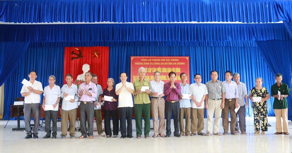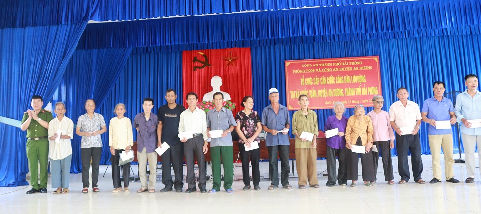 Sáng 18-7, Phòng Cảnh sát Quản lý Hành chính về TTXH (Phòng PC06) – CATP phối hợp với Công an huyện An Dương và chính quyền địa phương, các doanh nghiệp, đại diện Hội những người con quê hương xã Quốc Tuấn tổ chức cấp Căn cước công dân (CCCD) lưu động; tặng quà các Mẹ Việt Nam Anh hùng, gia đình chính sách, người có công với cách mạng, xã Quốc Tuấn, An Dương. Tham dự có các đồng chí: Thượng tá Nguyễn Đăng Quang – Phó Trưởng phòng PC06 – CATP; Thượng tá Đinh Phúc Long – Phó Trưởng Công an huyện An Dương và Thiếu Tướng Đinh Thế Hòa – Nguyên Phó Chính ủy Quân Khu I, đại diện cho Hội những người con quê hương xã Quốc Tuấn.