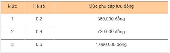 Căn cứ khoản 1 Mục II Thông tư 06/2005/TT-BNV thì phụ cấp lưu động gồm 3 mức: 0,2; 0,4 và 0,6 so với mức lương tối thiểu chung (mức lương cơ sở).