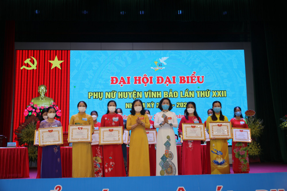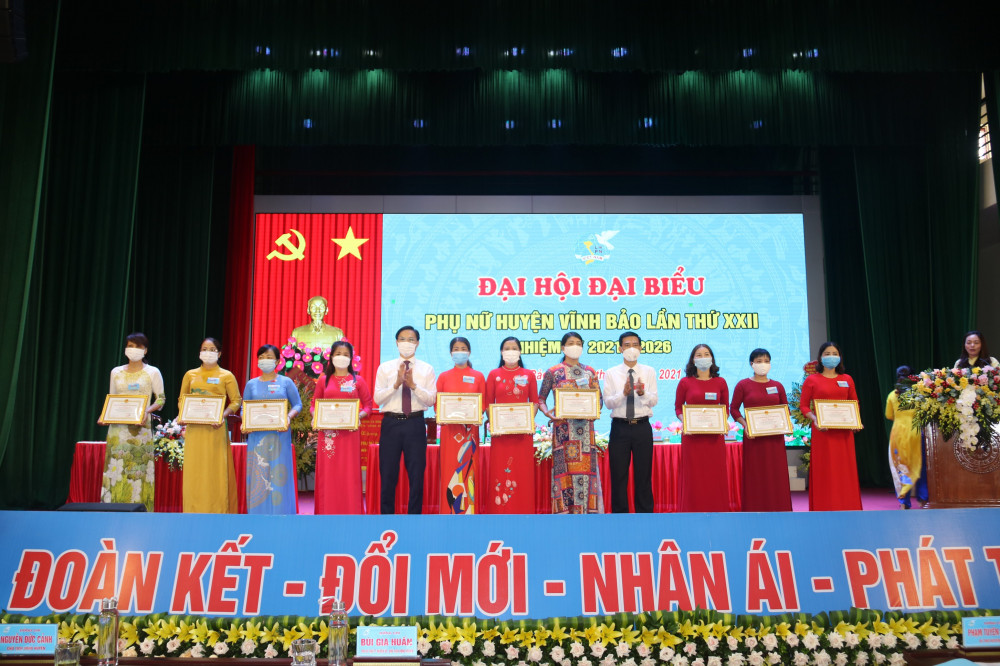 Nhân dịp này, Huyện ủy – HĐND – UBND – Ủy ban MTTQ Việt Nam huyện đã tặng Hội LHPN huyện bức trướng mang dòng chữ “Hội liên hiệp Phụ nữ Vĩnh Bảo đoàn kết – đổi mới – nhân ái – phát triển”. Nhiều tập thể và cá nhân có thành tích xuất sắc trong công tác Hội và phong trào phụ nữ nhiệm kỳ 2016-2021 vinh dự được nhận Bằng khen của Hội LHPN thành phố; Giấy khen của UBND huyện Vĩnh Bảo và của Hội LHPN huyện.