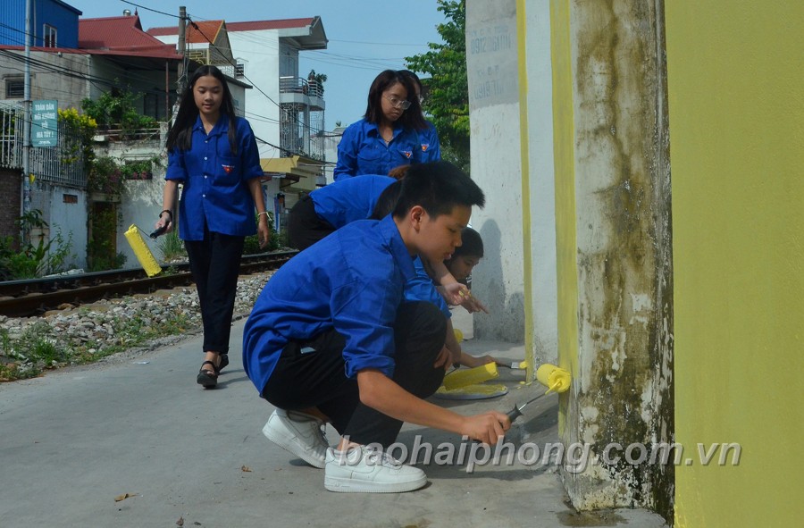 Sáng 7-10, phường Cát Dài (quận Lê Chân) triển khai sơn tường các hộ mặt ngõ khu vực đường tàu. Đây là phường được quận Lê Chân chọn làm thí điểm, từ đó rút kinh nghiệm triển khai rộng tại các hộ, cơ quan, công sở mặt đường các tuyến phố.
