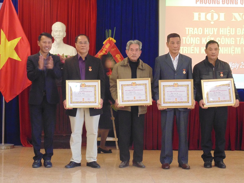 Bí thư Đảng ủy phường Đồng Quốc Bình Lê Đức Tùng trao huy hiệu Đảng tặng các đảng viên