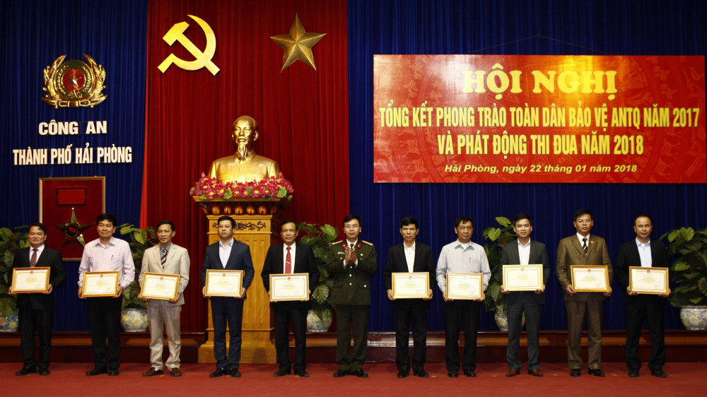 Cán bộ và nhân dân phường Đồng Quốc Bình (quận Ngô Quyền) được Bộ Công an tặng bằng khen vì thành tích xuất sắc trong phong trào Toàn dân bảo vệ ANTQ năm 2017 (thứ 3 từ phải sang)