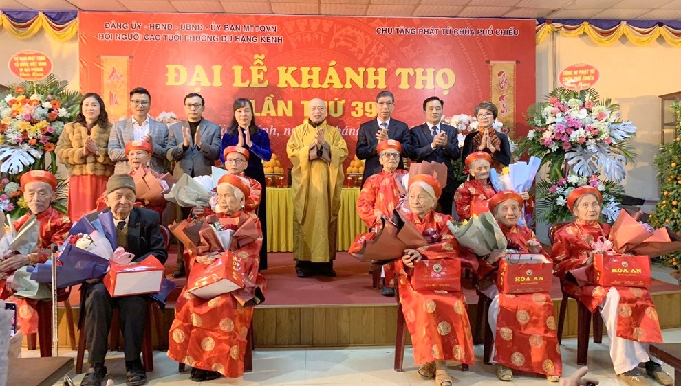Sáng 29/1/2023 (mùng 8 tháng giêng năm Quý Mão), tại chùa Phổ Chiếu, phường Dư Hàng Kênh, quận Lê Chân, chư tôn đức Tăng chùa Phổ Chiếu phối hợp với Đảng ủy, HĐND, UBND, UB MTTQ và Hội người cao tuổi phường Dư Hàng Kênh tổ chức lễ Khánh Thọ lần thứ 39 cho 414 cụ ông, cụ bà tròn tuổi 70, 75, 80, 85 và trên 90 tuổi đang sinh sống trên địa bàn phường.