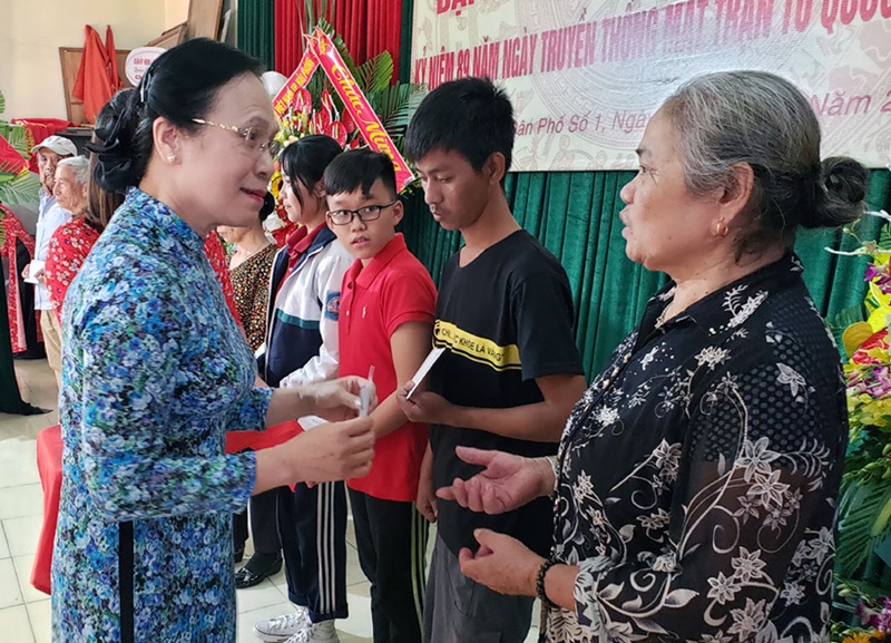 Đồng chí Nguyễn Thị Nghĩa, Phó Bí thư Thường trực Thành ủy, Trưởng đoàn Đại biểu Quốc hội Hải Phòng tặng quà những gia đình chính sách và hộ nghèo trên địa bàn