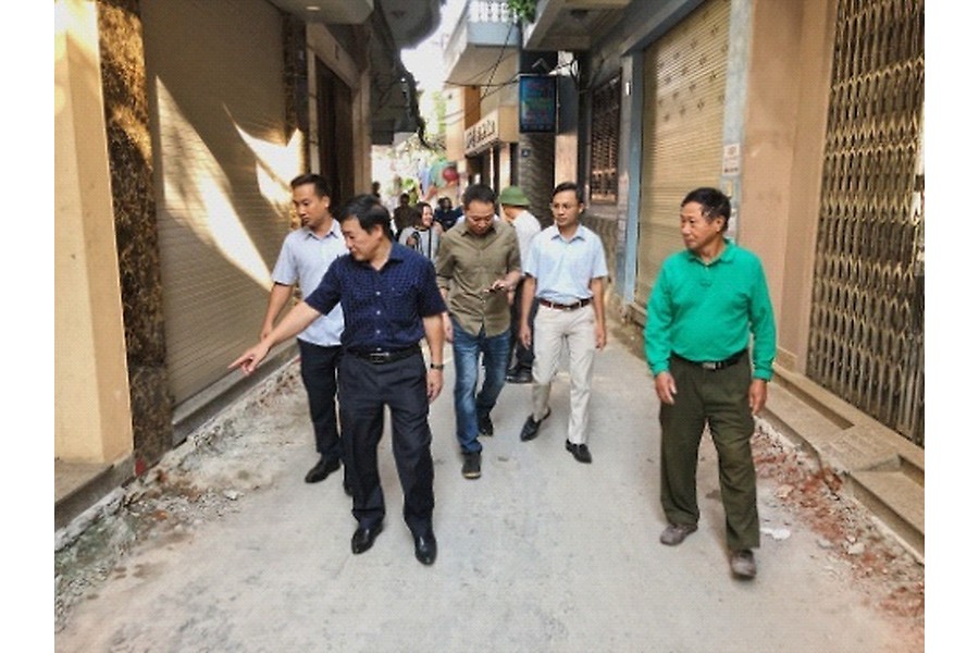 Lãnh đạo UBND quận Lê Chân kiểm tra việc cải tạo, nâng cấp ngõ 169 Trần Nguyên Hãn theo cơ chế hỗ trợ xi măng của thành phố.