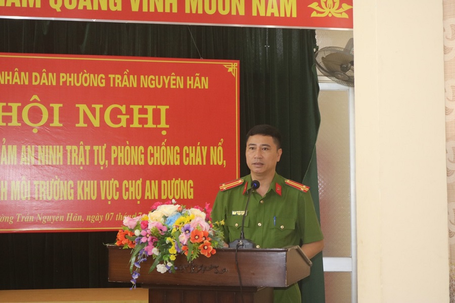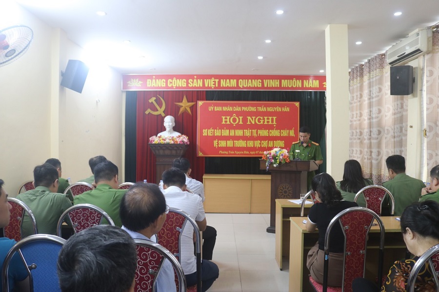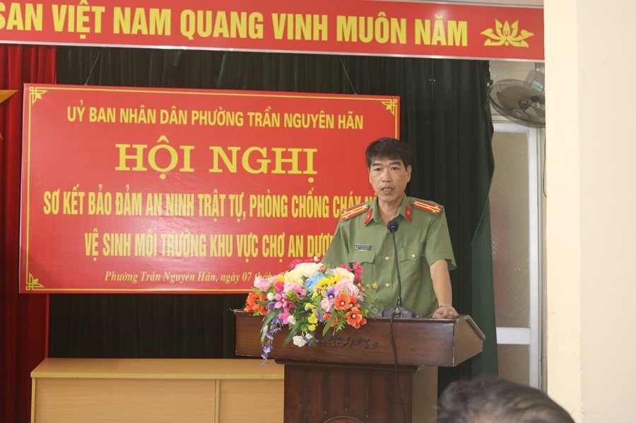 Sáng 7/7, phường Trần Nguyên Hãn, quận Lê Chân tổ chức hội nghị sơ kết bảo đảm ANTT, phòng chống cháy nổ, vệ sinh môi trường khu vực chợ An Dương. Thượng tá Nguyễn Xuân Chỉnh, Phó trưởng phòng xây dựng phong trào bảo vệ ANTQ CATP đến dự.