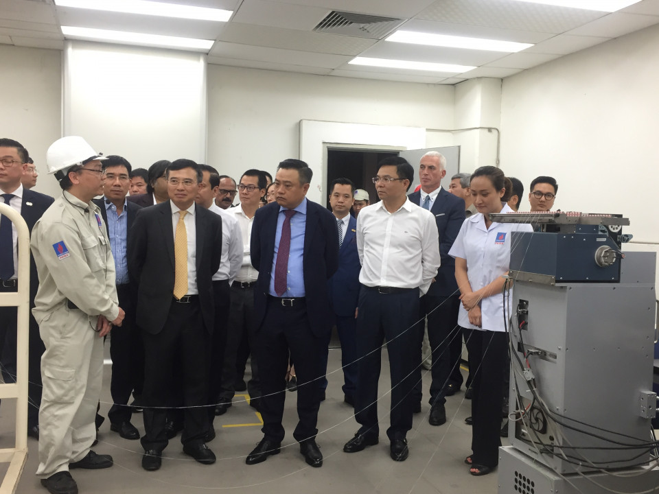 Thứ trưởng Bộ Công Thương Hoàng Quốc Vượng, Chủ tịch Tập đoàn Dầu khí Việt Nam Trần Sỹ Thanh và các đối tác tham quan nhà máy.