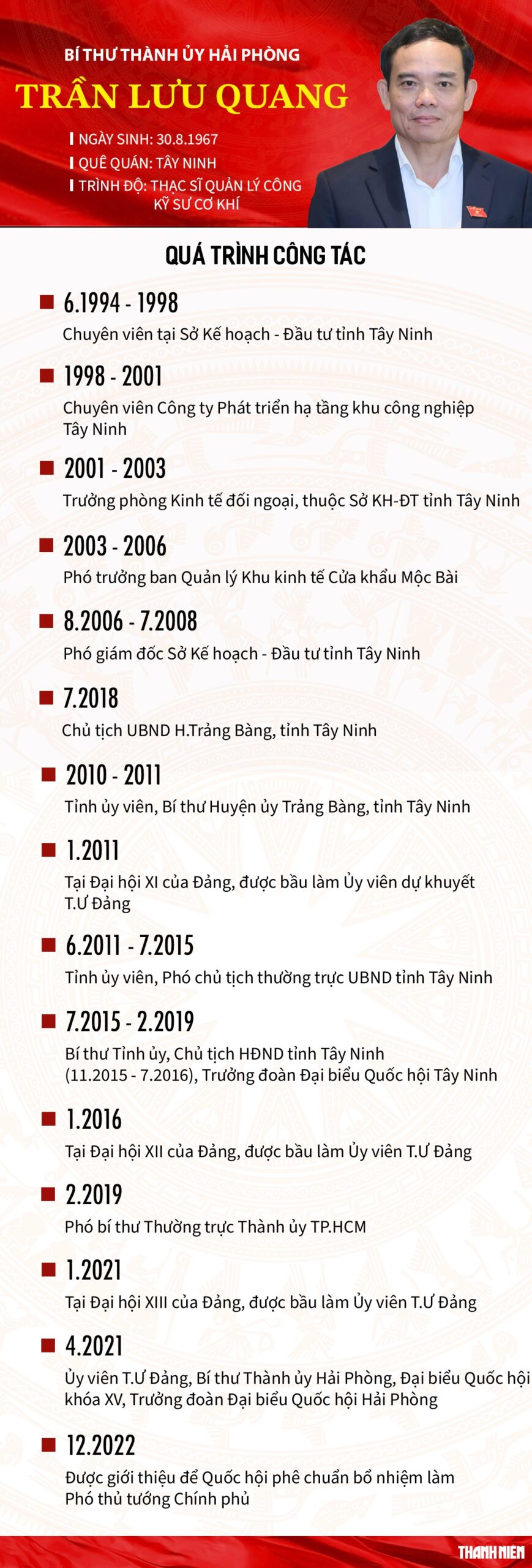 Từ chuyên viên Sở KH-ĐT Tây Ninh tới Bí thư Tây Ninh, tân Phó Thủ tướng Trần Lưu Quang có quá trình gắn bó công tác tới 22 năm tại quê hương trước khi được điều động làm Phó bí thư Thành ủy TP.HCM và Bí thư Thành ủy Hải Phòng trong 4 năm gần đây.