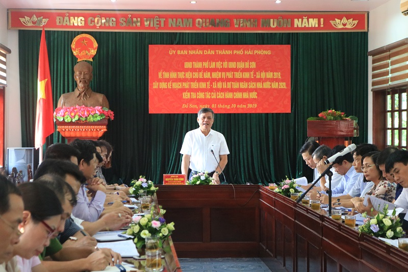 Phát biểu chỉ đạo tại buổi làm việc, Phó Chủ tịch Thường trực UBND thành phố Nguyễn Xuân Bình biểu dương và ghi nhận những nỗ lực của quận Đồ Sơn trong thời gian qua. Tính đến hết tháng 9-2019, quận Đồ Sơn hoàn thành vượt mức kế hoạch 6/17 chỉ tiêu thành phố giao, dự kiến 11 chỉ tiêu còn lại sẽ hoàn thành và hoàn thành vượt mức trong năm 2019. Đồng chí Nguyễn Xuân Bình cũng yêu cầu quận Đồ Sơn tập trung quyết liệt hơn nữa công tác thu ngân sách, bảo đảm tiến độ giải ngân theo kế hoạch.