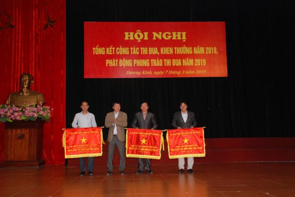 Đồng chí Đào Văn Ninh – Bí thư Quận ủy Dương Kinh trao Cờ thi đua của UBND TP tặng Ban Tuyên giáo Quận ủy, Thanh tra quận và UBND phường Hải Thành đã có thành tích xuất sắc hoàn thành nhiệm vụ năm 2018.