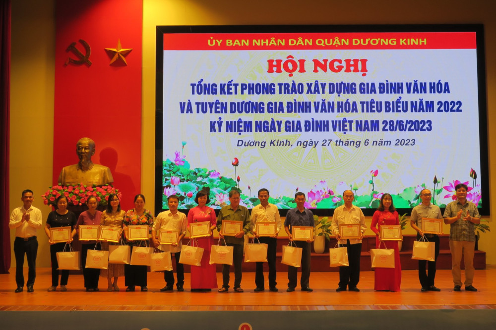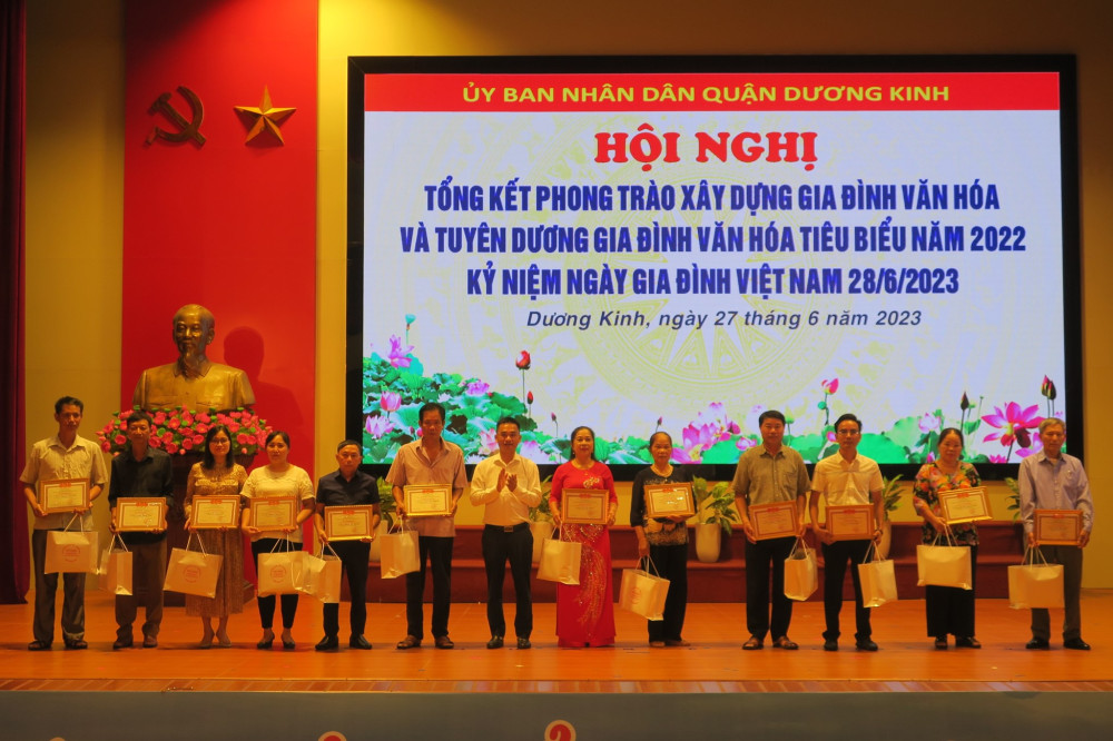 Nhân dịp này, UBND quận Dương Kinh tặng Giấy khen cho 12 gia đình có thành tích xuất sắc trong việc thực hiện Phong trào xây dựng Gia đình Văn hóa năm 2022; Ban Chỉ đạo Phong trào toàn dân đoàn kết xây dựng đời sống văn hóa quận Dương Kinh tuyên dương 51 gia đình đã có thành tích xuất sắc trong Phong trào Xây dựng Gia đình văn hóa năm 2022.