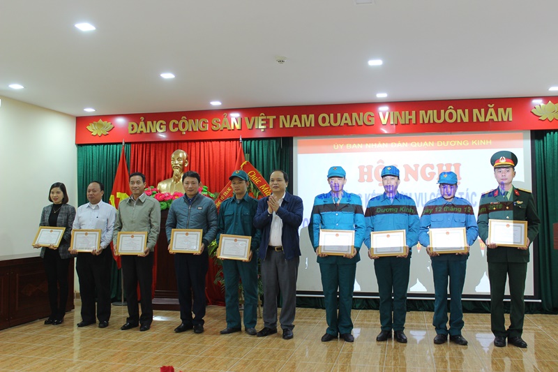 Đồng chí Lê Lương, Chủ tịch UBND quận Dương Kinh khen thưởng các tập thể, cá nhân có thành tích.