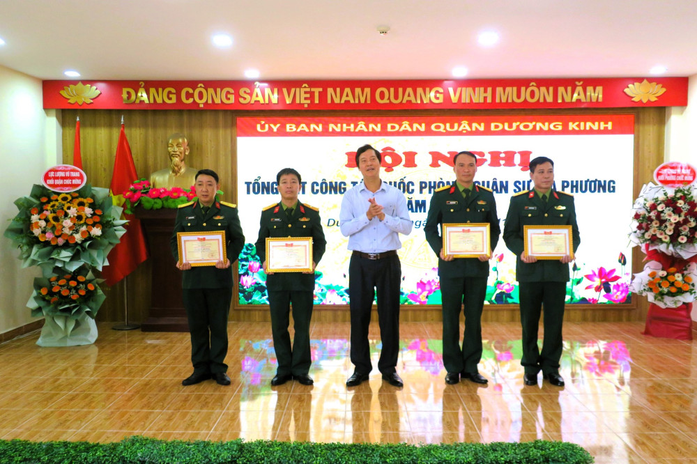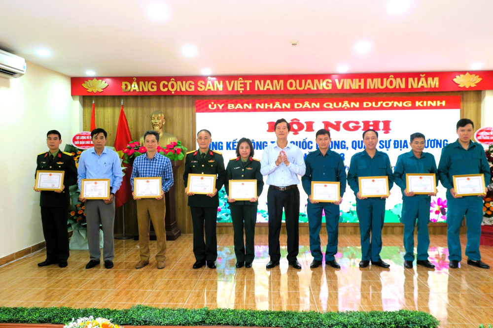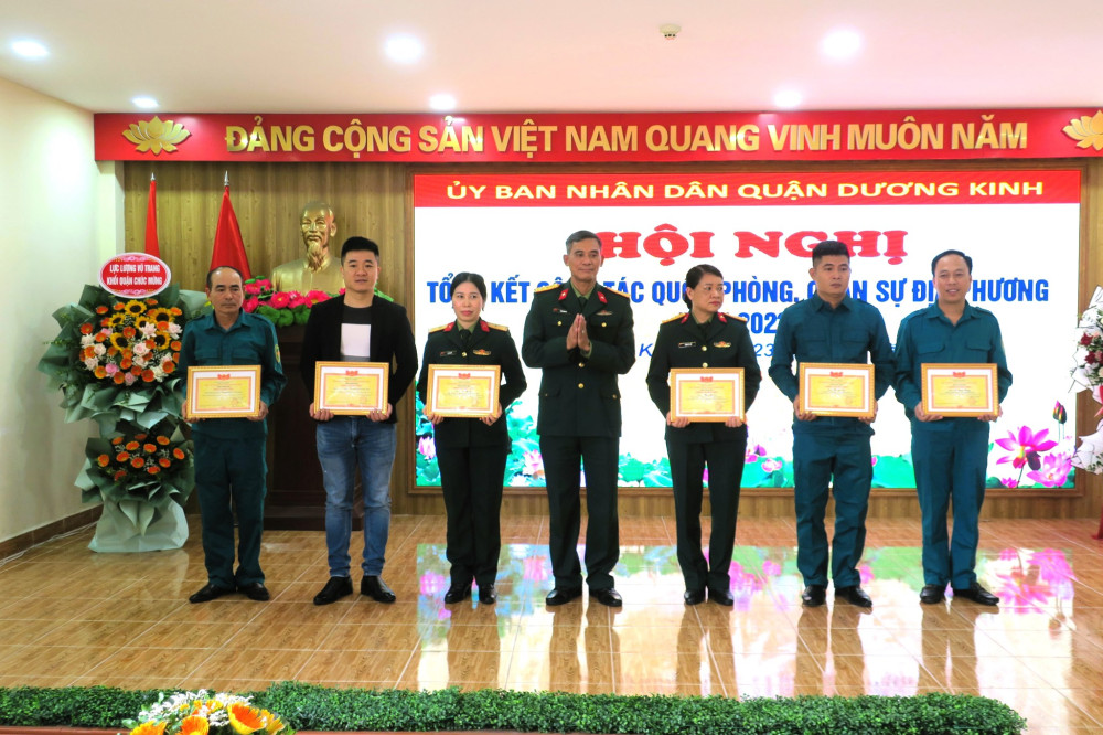 Nhân dịp này, Bộ Chỉ huy Quân sự thành phố tặng danh hiệu Chiến sĩ thi đua cơ sở cho 3 cá nhân, danh hiệu Chiến sĩ tiên tiến cho 2 cá nhân; UBND quận Dương Kinh tặng Giấy khen cho 3 tập thể và 6 cá nhân; Ban Chỉ huy Quân sự quận Dương Kinh tặng danh hiệu Đơn vị tiên tiến cho 2 tập thể, danh hiệu Chiến sĩ tiên tiến cho 4 cá nhân có thành tích xuất sắc trong triển khai thực hiện Phong trào Thi đua Quyết thắng trên địa bàn quận năm 2023.