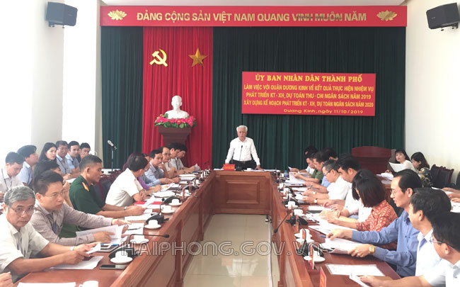 Sáng 11/10, Phó Chủ tịch UBND thành phố Nguyễn Đình Chuyến làm việc với quận Dương Kinh về tình hình thực hiện Chủ đề năm 2019, kết quả thực hiện kế hoạch phát triển kinh tế – xã hội và dự toán thu – chi ngân sách nhà nước năm 2019; xây dựng kế hoạch phát triển kinh tế – xã hội và dự toán ngân sách nhà nước năm 2020 và kiểm tra công tác cải cách hành chính năm 2019. Cùng dự có lãnh đạo các sở, ngành, đơn vị liên quan.