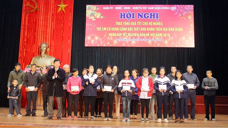 Chiều 21-1, quận Dương Kinh tổ chức hội nghị trao 741 suất quà Tết tặng các hộ nghèo, cận nghèo, học sinh có hoàn cảnh đặc biệt khó khăn trên địa bàn với tổng số kinh phí gần 388 triệu đồng. Trong đó, có 74 suất quà, mỗi suất 700 nghìn đồng tặng trẻ em; 181 suất quà, mỗi suất 700 nghìn đồng tặng hộ nghèo và 488 suất quà, mỗi suất 500 nghìn đồng tặng hộ cận nghèo.