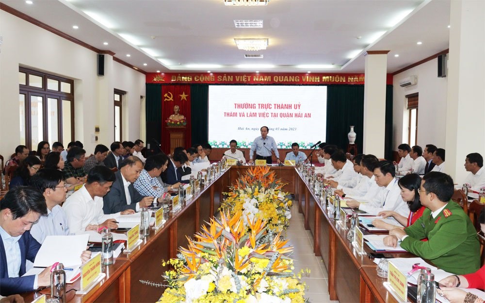 Báo cáo tại cuộc làm việc, đồng chí Nguyễn Văn Tuấn, Bí thư Quận ủy, Chủ tịch HĐND quận Hải An cho biết, bám sát sự lãnh đạo, chỉ đạo của thành phố, Đảng bộ quận Hải An luôn phấn đấu hoàn thành cơ bản, toàn diện các chỉ tiêu, nhiệm vụ về phát triển kinh tế xã hội, xây dựng Đảng, chính quyền và hệ thống chính trị, trong đó đã tập trung lãnh đạo, chỉ đạo hoàn thành một số việc trọng tâm như: tham mưu Ban Thường vụ Thành ủy tổng kết Nghị quyết 24 về xây dựng và phát triển quận Hải An đến năm 2010, định hướng đến năm 2020; thực hiện công tác GPMB phục vụ các công trình, dự án trọng điểm; xử lý một số vấn đề phức tạp về lĩnh vực đất đai, trật tự xây dựng, điển hình là tồn tại của Dự án 2,6ha phường Đông Hải 1, việc vi phạm tại khu đất 9,2ha phường Thành Tô, xử lý vi phạm các hộ nuôi ngao không phép trên vùng biển thuộc địa bàn quận, thu hồi đất của Công ty TNHH và Thương mại dịch vụ Duy Hưng, xử lý vi phạm tại Hồ Điều hòa Phương Lưu, vi phạm tại tuyến đường 68m trên địa bàn phường Đông Hải 2…