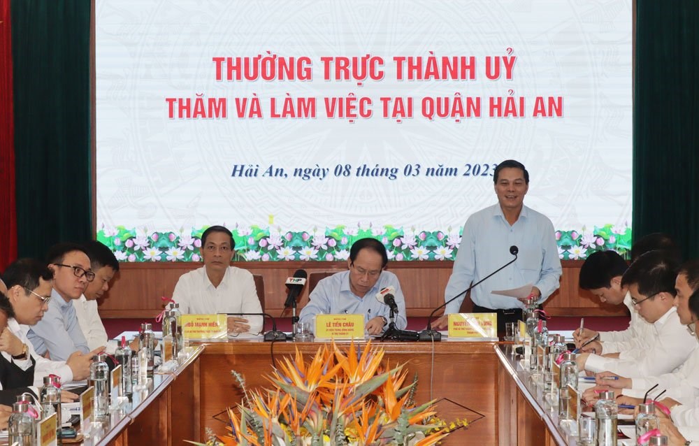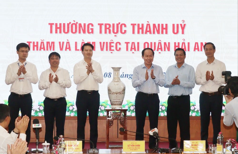 Tại cuộc làm việc, đồng chí Bí thư Thành ủy Lê Tiến Châu bày tỏ đồng tình và phấn khởi về những kết quả nổi bật từ đầu nhiệm kỳ của Ban Chấp hành Đảng bộ quận Hải An, phương thức lãnh đạo, chỉ đạo của cấp ủy ngày càng được đổi mới, công tác xây dựng chính quyền được chú trọng, ngày càng hiệu lực, hiệu quả với nhiều cách làm hay sáng tạo, đảm bảo đúng định hướng. Trong phát triển kinh tế, Hải An đã trở thành điểm sáng, một trong những động lực tăng trưởng chủ yếu của thành phố, cơ cấu kinh tế tiếp tục chuyển dịch theo hướng công nghiệp-dịch vụ, thu ngân sách quận đạt và vượt tiến độ đề ra, đến năm 2022, quận đã đạt 48,5% chỉ tiêu Nghị quyết Đại hội, lĩnh vực đô thị, đất đai được tăng cường, hạn chế vi phạm mới xảy ra, an sinh xã hội được đảm bảo…