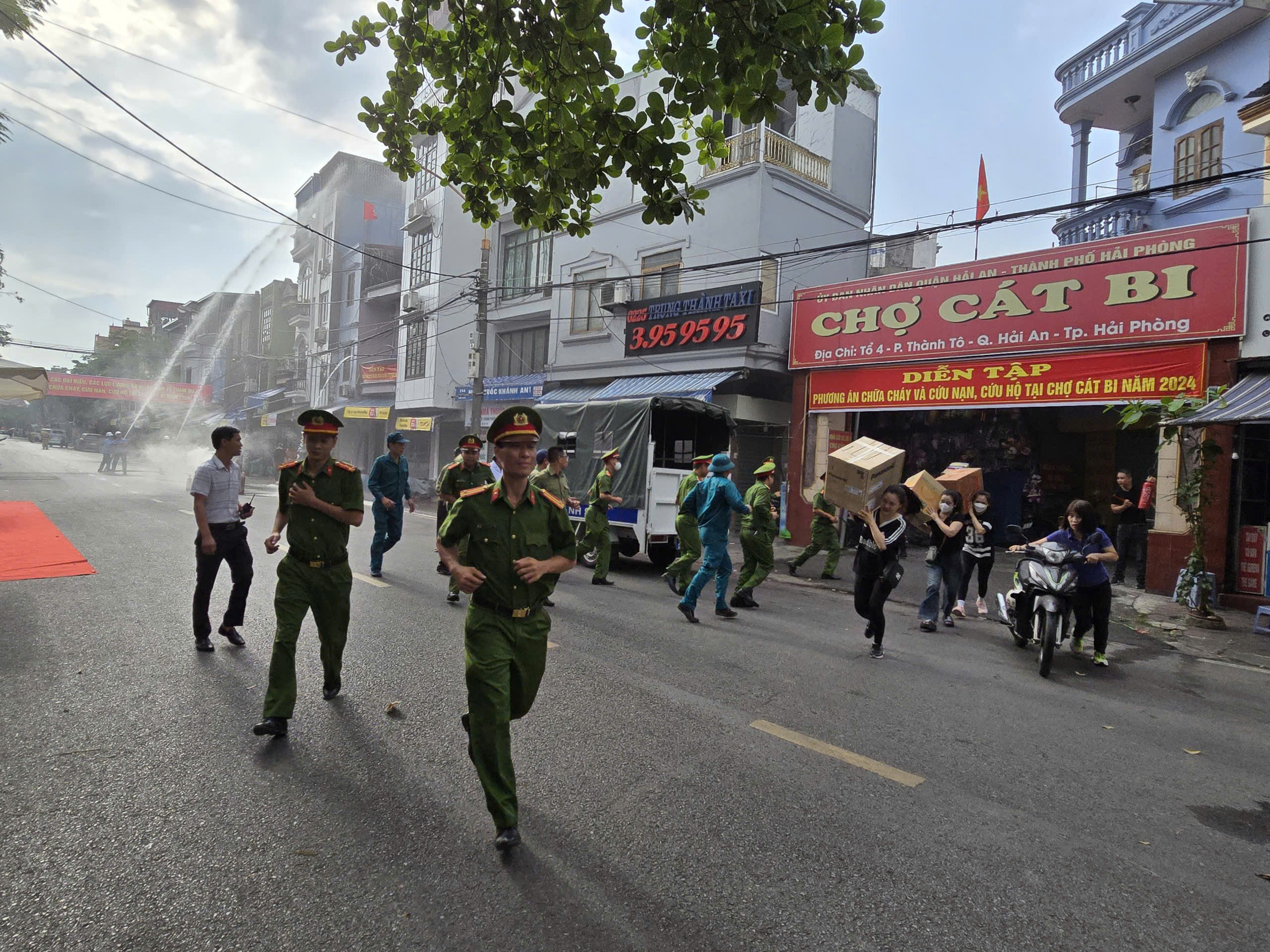 Theo đó, tình huống giả định xảy ra cháy tại khu vực ki ốt bán hàng quần áo bên trong chợ Cát Bi. Nguyên nhân do hộ kinh doanh tự ý đấu mắc nguồn điện và hệ thống điện chiếu sáng bảo vệ của chợ và khi ra về quên không tắt quạt điện dẫn đến xảy ra sự cố chập mạnh điện gây cháy. Ngay khi phát hiện đám cháy, lực lượng PCCC của Ban quản lý chợ đã nhanh chóng báo động, cắt điện khu vực bị cháy và thông báo cho mọi người ở bên trong nhanh chóng thoát ra các cửa đến khu vực an toàn. Đồng thời sử dụng phương tiện, công cụ chữa cháy và CNCH tại chỗ, tiến hành sơ tán người và hàng hóa ra khỏi chợ. Do chất cháy trong chợ đều là chất dễ cháy, khối lượng lớn nên đám cháy nhanh chóng lan rộng ra các khu vực xung quanh tỏa ra một lượng lớn kèm theo khói và khí độc gây khó khăn cho công tác chữa cháy và cứu nạn cứu hộ của lực lượng chữa cháy cơ sở. Ban Quản lý chợ đã gọi điện báo cháy cho lực lượng chữa cháy chuyên nghiệp, đồng thời gọi điện báo cho chính quyền địa phương và lực lượng cảnh sát PCCC và CNCH Công an quận đến để hỗ trợ.