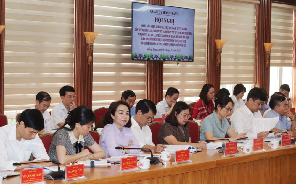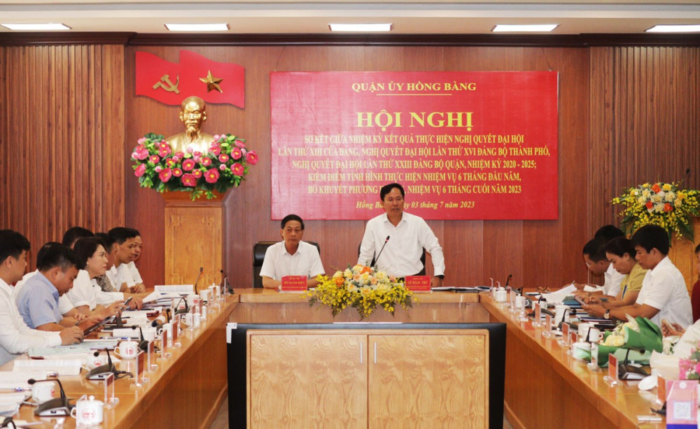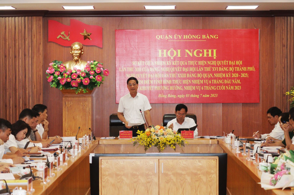Chiều 3/7, Quận ủy Hồng Bàng tổ chức Hội nghị sơ kết giữa nhiệm kỳ thực hiện Nghị quyết Đại hội XIII của Đảng, Nghị quyết Đại hội XVI Đảng bộ thành phố, Nghị quyết Đại hội XXIII Đảng bộ quận, nhiệm kỳ 2020-2025; kiểm điểm tình hình thực hiện nhiệm vụ 6 tháng đầu năm, bổ khuyết phương hướng nhiệm vụ 6 tháng cuối năm 2023.