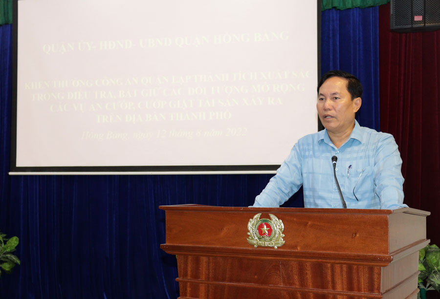 Sáng 12/8, tại trụ sở Công an quận Hồng Bàng, Đoàn công tác của quận Hồng Bàng do đồng chí Lê Ngọc Trữ, Ủy viên Ban Thường vụ Thành ủy, Bí thư Quận ủy làm Trưởng đoàn đến khen thưởng Công an quận lập thành tích xuất sắc trong điều tra, bắt giữ các đối tượng, mở rộng các vụ án cướp, cướp giật tài sản xảy ra trên địa bàn.