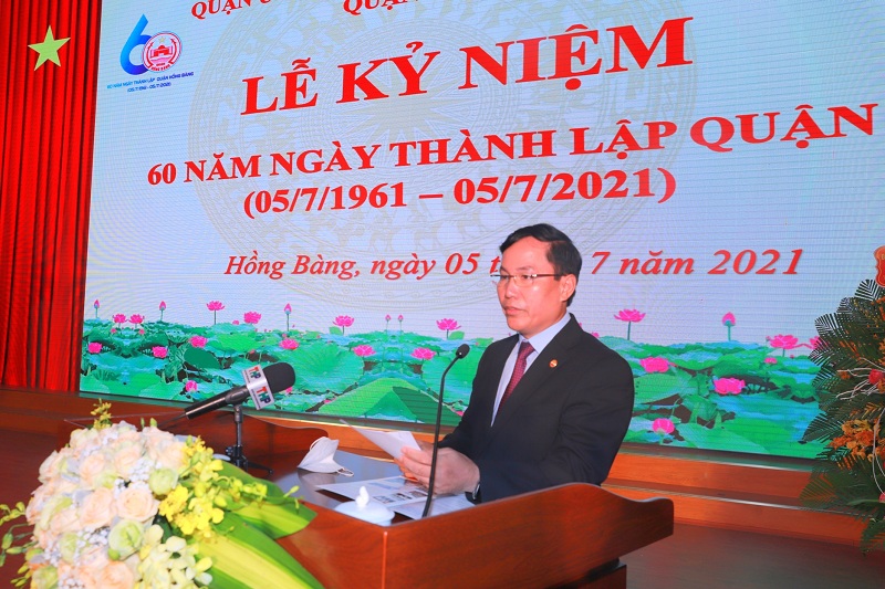 Tại lễ kỷ niệm, đồng chí Lê Ngọc Trữ, Ủy viên BTV Thành ủy, Bí thư Quận ủy ôn lại truyền thống lịch sử 60 năm của quận Hồng Bàng. Suốt chặng đường 60 năm qua, quận Hồng Bàng luôn tự hào là “cái nôi” ra đời của đô thị Hải Phòng, là nơi đặt trụ sở Trung tâm chính trị-hành chính và nhiều cơ quan trọng yếu của thành phố. Lịch sử đấu tranh, xây dựng và phát triển của quận Hồng Bàng gắn liền với lịch sử hình thành, đấu tranh và phát triển của thành phố Cảng, ghi lại nhiều chiến công anh dũng. Qua 60 năm xây dựng và phát triển, nhất là 35 năm thực hiện công cuộc đổi mới, quận khẳng định vị thế là trung tâm kinh tế, chính trị, văn hóa, giáo dục, đầu mối giao thông quan trọng của thành phố, cơ cấu chuyển dịch đúng hướng, các ngành thương mại, dịch vụ phát triển chiếm tỷ trọng hơn 70% trong cơ cấu kinh tế. Tổng thu cân đối ngân sách giai đoạn 2015-2020 đạt hơn 7.319 tỷ đồng, tốc độ tăng thu ngân sách trung bình hằng năm đạt 17,55%. Thuế ngoài quốc doanh đạt gần 1.732 tỷ đồng. Công tác chỉnh trang và phát triển đô thị có bước phát triển đột phá với nhiều công trình trọng điểm được đầu tư xây dựng; đặc biệt, công tác giải phóng mặt bằng thực hiện các dự án được thành phố ghi nhận là điểm sáng. Chất lượng cuộc sống nhân dân được nâng cao, trên địa bàn quận không còn hộ nghèo. Nhiều năm liên tục, Hồng Bàng dẫn đầu thành phố về công tác cải cách hành chính, chất lượng phục vụ người dân ngày càng tốt hơn, cung cấp 100% thủ tục hành chính công ở mức độ 3 trở lên; an ninh chính trị, trật tự an toàn xã hội được giữ vững; tạo nền tảng vững chắc cho sự phát triển của quận. Công tác xây dựng Đảng có nhiều cách làm sáng tạo, đạt hiệu quả cao; đặc biệt, triển khai thực hiện có hiệu quả Nghị quyết Trung ương 4 khóa XI, XII về xây dựng, chỉnh đốn Đảng gắn với việc thực hiện Chỉ thị 03, Chỉ thị 05 của Bộ Chính trị về học tập và làm theo tư tưởng, đạo đức, phong cách Hồ Chí Minh. Hoạt động của Ủy ban MTTQ và các đoàn thể chính trị-xã hội quận đạt nhiều kết quả nổi bật, đóng góp quan trọng vào sự phát triển của quận.