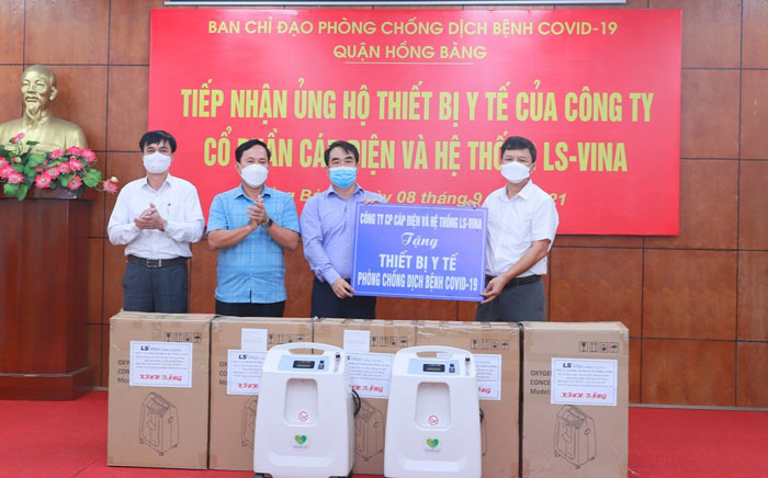 Cũng trong chiều 8/9, quận Hồng Bàng tổ chức tiếp nhận ủng hộ thiết bị y tế của Công ty Cổ phần cáp điện và hệ thống – LS Vina. Công ty đã trao tặng 5 chiếc máy điều chế oxy hiện đại, trị giá 100 triệu đồng, có thể sử dụng hỗ trợ oxy cho 2 bệnh nhân COVID-19 cùng lúc.