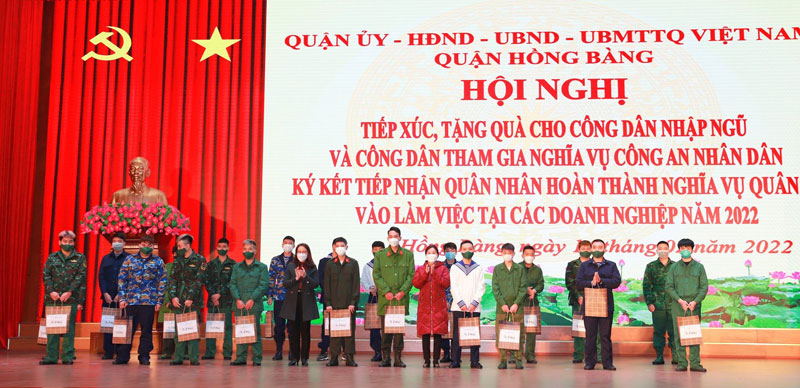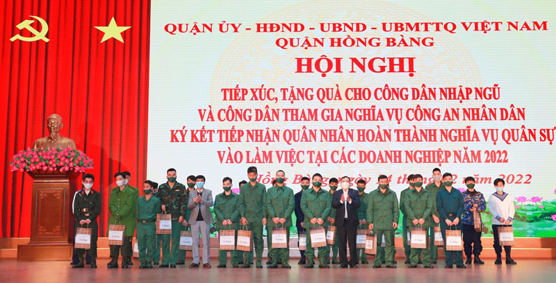 Sáng 14/2, quận Hồng Bàng tổ chức Hội nghị tiếp xúc, tặng quà cho công dân nhập ngũ và công dân tham gia nghĩa vụ Công an nhân dân năm 2022; ký kết tiếp nhận quân nhân hoàn thành nghĩa vụ quân sự vào làm việc tại các doanh nghiệp năm 2022. Dự Hội nghị có đồng chí Lê Ngọc Trữ, Ủy viên Ban Thường vụ Thành ủy, Bí thư Quận ủy Hồng Bàng.