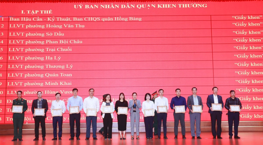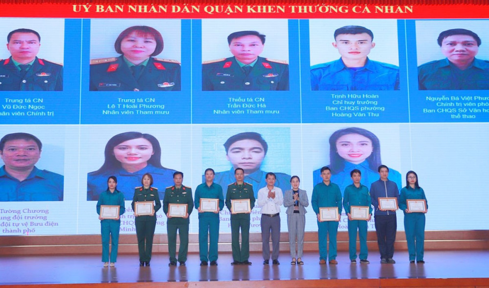 Tại Hội nghị, Bộ Chỉ huy quân sự thành phố đã trao tặng danh hiệu Chiến sỹ thi đua cơ sở cho 02 cá nhân, Chiến sỹ thi đua tiên tiến cho 02 cá nhân; Chủ tịch UBND quận tặng Giấy khen cho 13 tập thể, 09 cá nhân; Ban Chỉ huy quân sự quận tặng Giấy khen cho 05 tập thể, 06 cá nhân.