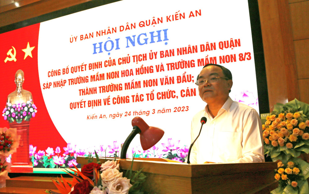 Chiều 24/3, UBND quận Kiến An tổ chức Hội nghị công bố Quyết định sáp nhập Trường Mầm non Hoa Hồng và Mầm non 8/3 thành trường Mầm non Văn Đẩu; Quyết định về công tác cán bộ các Trường Mầm non: Văn Đẩu, Hoa Phượng, Quán Trữ, Nhi Đức và Đồng Hòa.