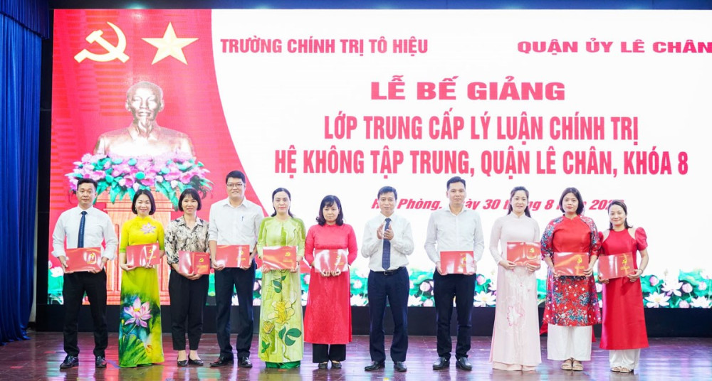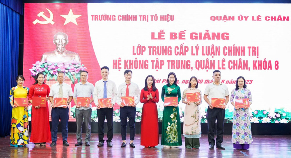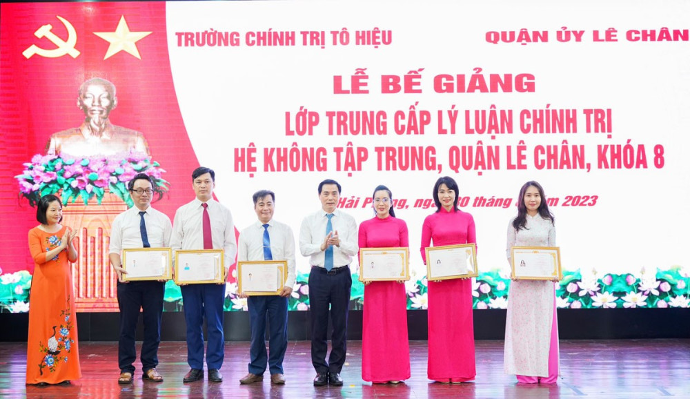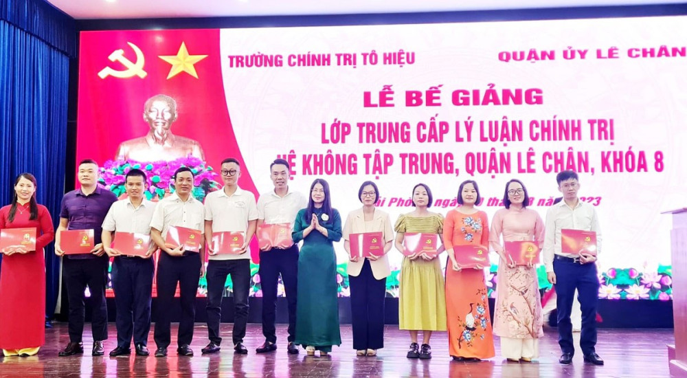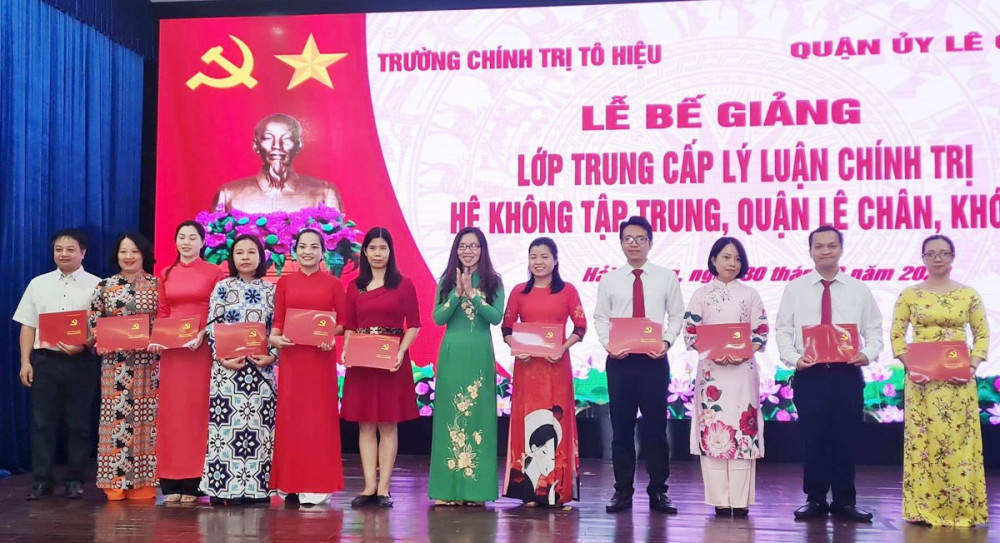 Nhân dịp này, Hiệu trưởng Trường Chính trị Tô Hiệu tặng Giấy khen cho 06 học viên có thành tích, ý thức học tập tốt, chấp hành tốt các nội quy, quy chế của Trường, các quy định của lớp; lãnh đạo Trường Chính trị Tô Hiệu và lãnh đạo Quận ủy Lê Chân đã trao bằng tốt nghiệp cho các học viên.