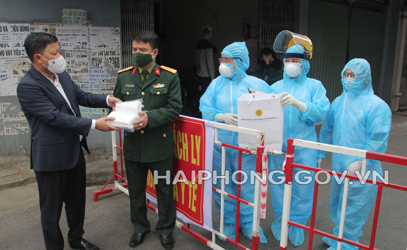 Nhân dịp này, đồng chí Lê Trung Kiên, Trưởng Ban quản lý Khu Kinh tế Hải Phòng đã trao tặng 1.000 khẩu trang cho các chốt kiểm soát phòng, chống dịch tại khu vực bị phong tỏa trên địa bàn phường Dư Hàng.