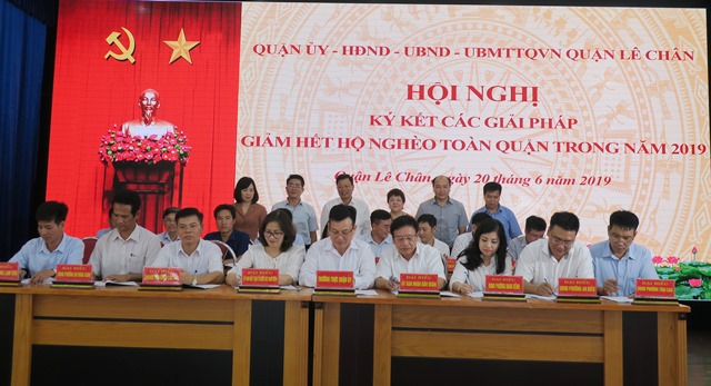 Tại Hội nghị, đại diện lãnh đạo Quận ủy – UBND – Ủy ban MTTQ Việt Nam quận cùng 15 phường trên địa bàn đã ký kết thể hiện quyết tâm giảm hết hộ nghèo bền vững toàn quận Lê Chân trong năm 2019.