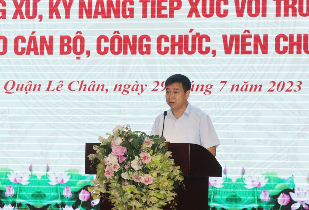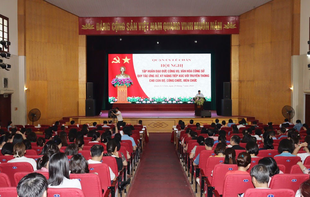 Sáng 29/7, Quận ủy Lê Chân tổ chức Hội nghị tập huấn đạo đức công vụ, văn hóa công sở, quy tắc ứng xử, kỹ năng tiếp xúc với truyền thông cho cán bộ, công chức, viên chức quận.