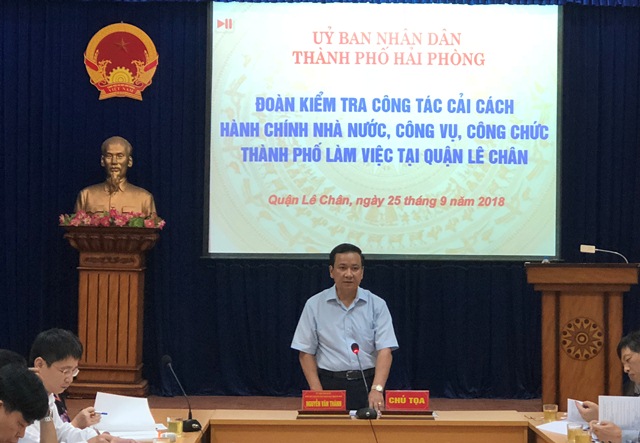 Chiều 25/9, Phó Chủ tịch UBND thành phố Nguyễn Văn Thành dẫn đầu đoàn kiểm tra công tác cải cách hành chính nhà nước, công vụ, công chức thành phố đến làm việc tại quận Lê Chân. Cùng dự có đại diện lãnh đạo các Sở, ngành liên quan.