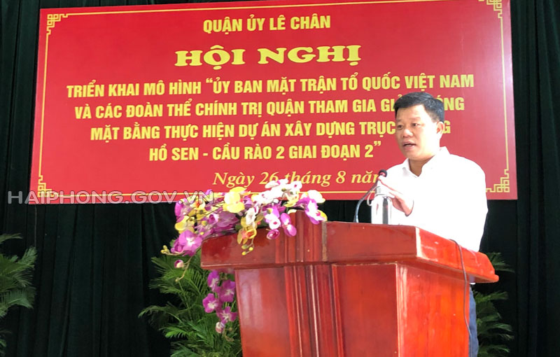 Nhằm đẩy nhanh tiến độ thực hiện Dự án theo kế hoạch đã đề ra, Quận ủy Lê Chân triển khai thực hiện mô hình “Ủy ban MTTQ Việt Nam và các đoàn thể chính trị quận tham gia GPMB thực hiện Dự án tuyến đường Hồ Sen – cầu Rào 2, giai đoạn 2” nhằm huy động sự vào cuộc, phát huy vai trò của Ủy ban MTTQ và các đoàn thể các cấp trong công tác thông tin, tuyên truyền đến người dân về ý nghĩa, tầm quan trọng của Dự án tuyến đường Hồ Sen – cầu Rào 2, giai đoạn 2, trách nhiệm của nhân dân đối với lợi ích chung của cộng đồng dân cư, sự phát triển của quận và thành phố; từ đó tạo sự chuyển biến mạnh mẽ từ nhận thức đến hành động của người dân trong việc chấp hành các chủ trương, chính sách của Đảng, nhà nước trong bồi thường GPMB, vận động nhân dân đồng thuận, ủng hộ, bàn giao mặt bằng để thực hiện dự án theo đúng tiến độ đã đề ra.