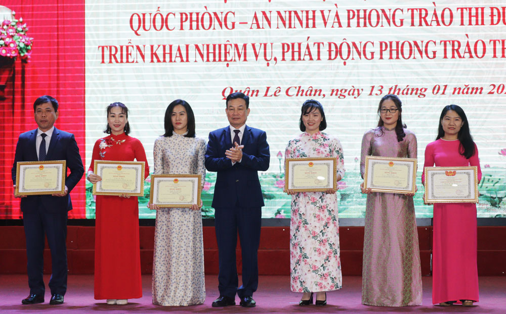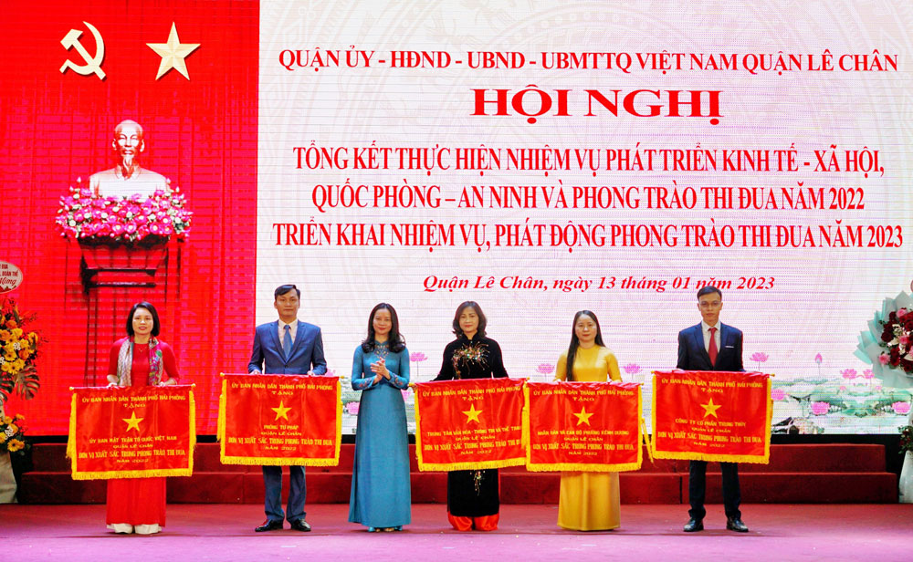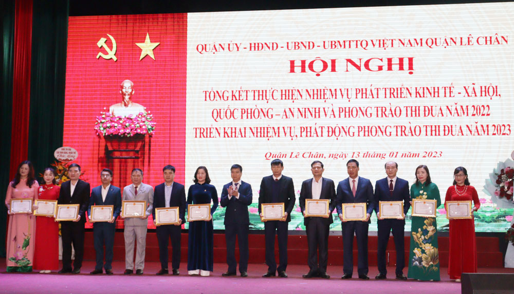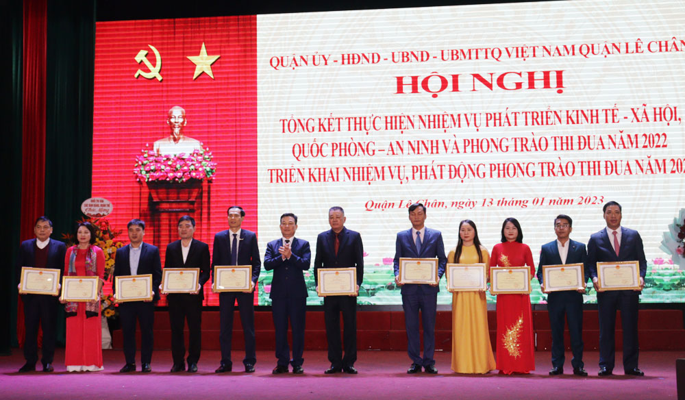 Nhân dịp này, UBND thành phố tặng Cờ thi đua cho 5 tập thể, tặng danh hiệu tập thể lao động xuất sắc cho 13 tập thể đã có thành tích hoàn thành xuất sắc nhiệm vụ công tác năm 2022; tặng Bằng khen cho 11 tập thể, 4 cá nhân đã có thành tích hoàn thành xuất sắc nhiệm vụ công tác năm 2021, 2022. Nhiều tập thể, cá nhân được UBND quận Lê Chân biểu dương, khen thưởng có thành tích hoàn thành xuất sắc nhiệm vụ năm 2022.